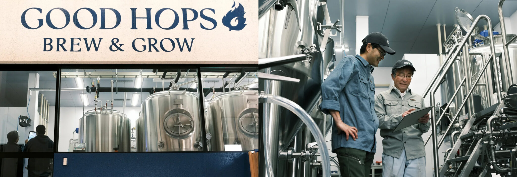 香り豊かで高品質な国産ホップが生産されている遠野に、新しい醸造所があるのをご存じでしょうか。その名も「GOOD HOPS」(2025年 春に開業)。こちらでサカツコーポレーション社員によるビール造りの体験も行いました。