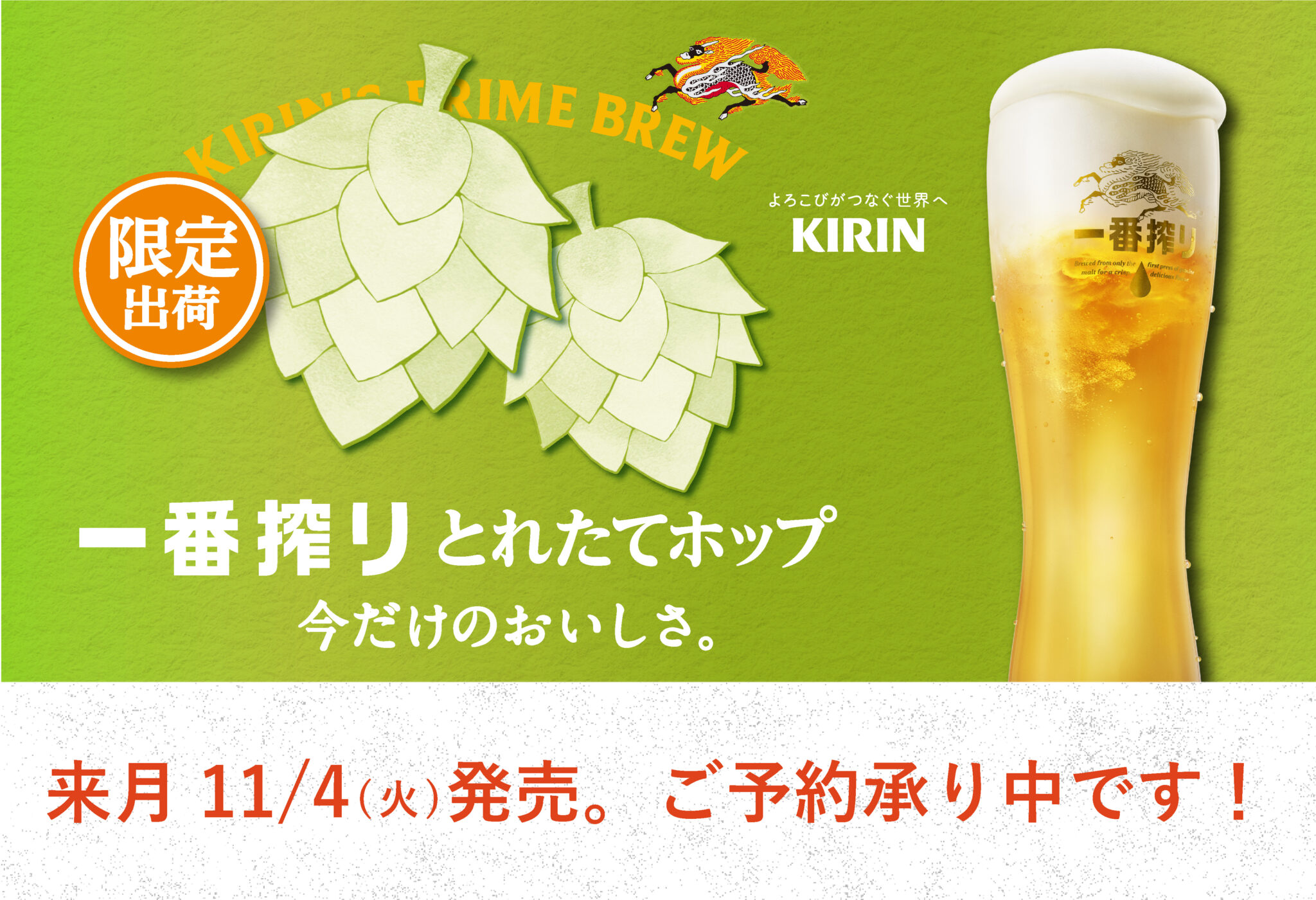 来月11月4日(火)発売。サカツコーポレーションでは、一番搾り とれたてホップ 生ビール 中瓶(20本/1ケース)・大瓶(20本/1ケース)のご予約注文を承っております。
