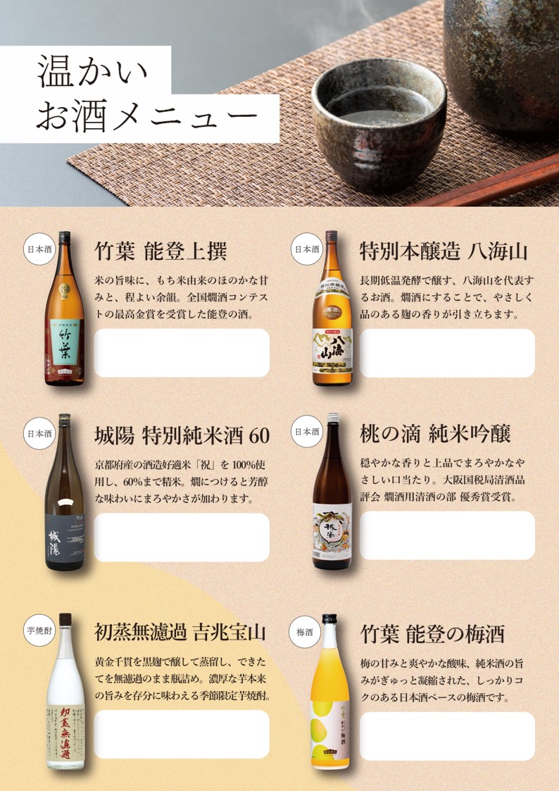 定番の日本酒に、芋焼酎や梅酒のお湯割り。