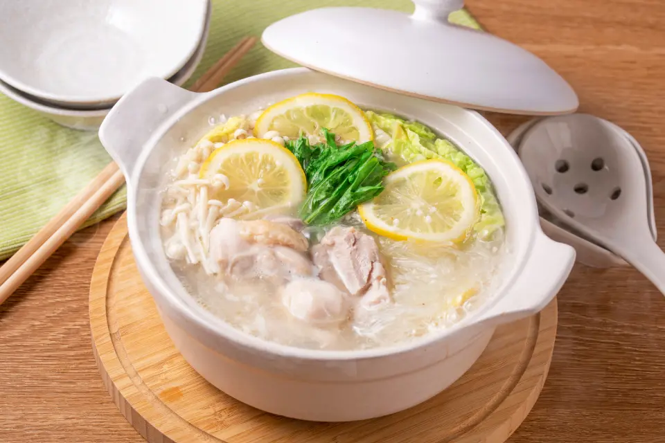 ④塩とお好みの野菜を加えて火が通るまで煮て、輪切りのレモンをのせれば完成!