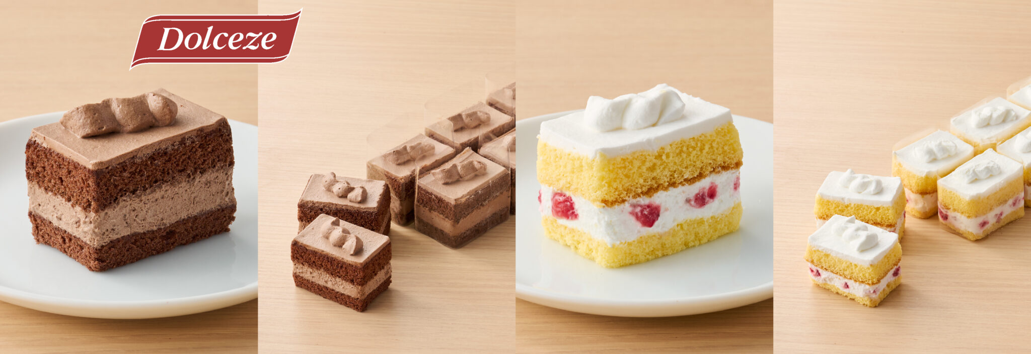 ドルチェーゼは業務専用ブランド。お店での提供シーンを想定して商品設計がされているのも大きな魅力です。冷凍品が多く、フリーカットや個食タイプのものも数多く、ロス軽減やオペレーション負荷の軽減にもつながっています!また、ケーキのスポンジシートやホイップクリーム、バルクアイスなどの素材や、自由にアレンジできるバースデーケーキのベースなど、お店の様々な用途に合った商品が揃っています。