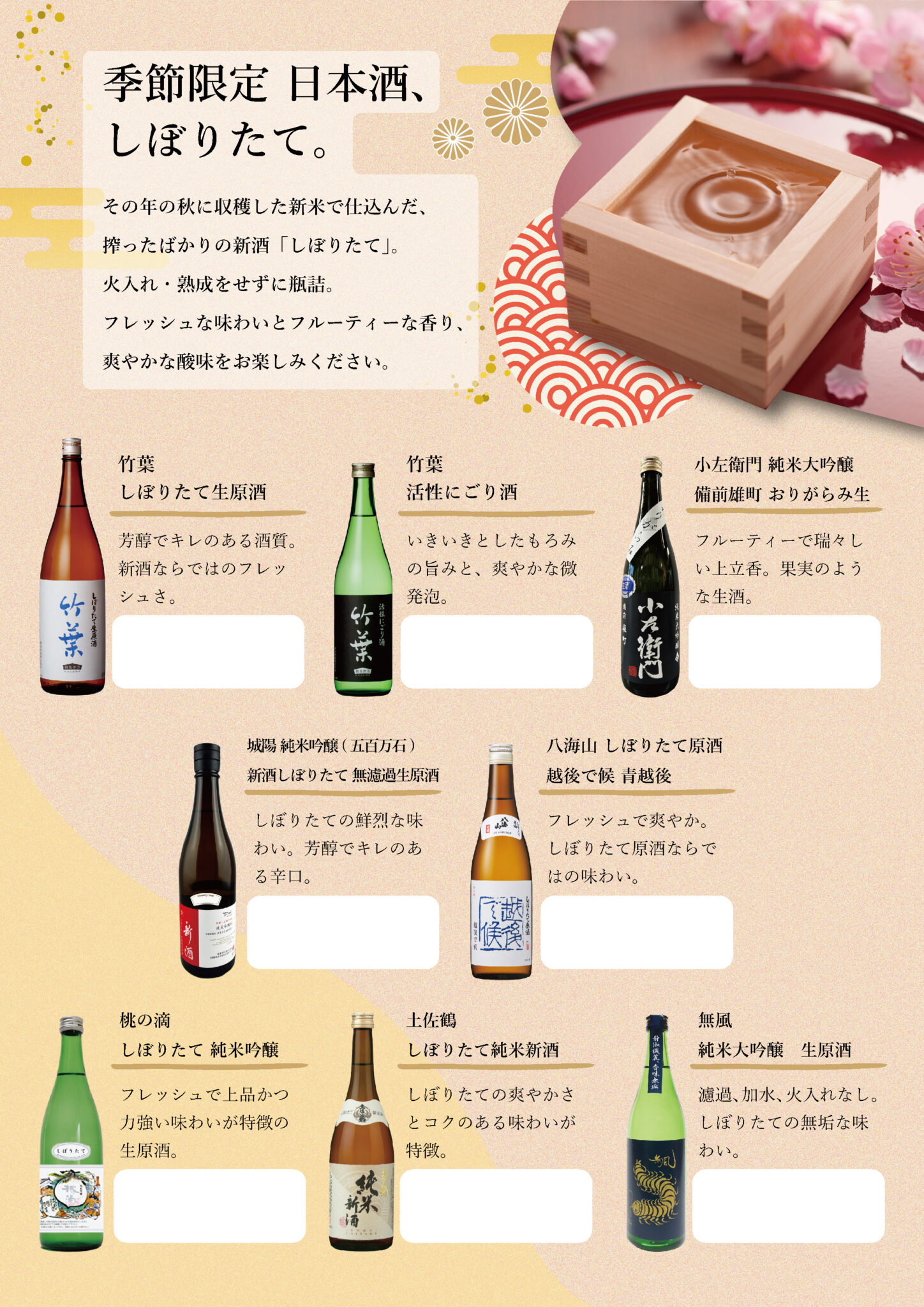 新酒の中でも、各酒蔵で搾ったばかりのお酒を「しぼりたて」と呼びます。